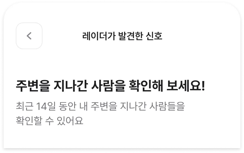 하단 메뉴의 [친구] → [레이더가 발견한 신호]에서 만났던 사람들의 프로필 목록을 확인할 수 있어요.